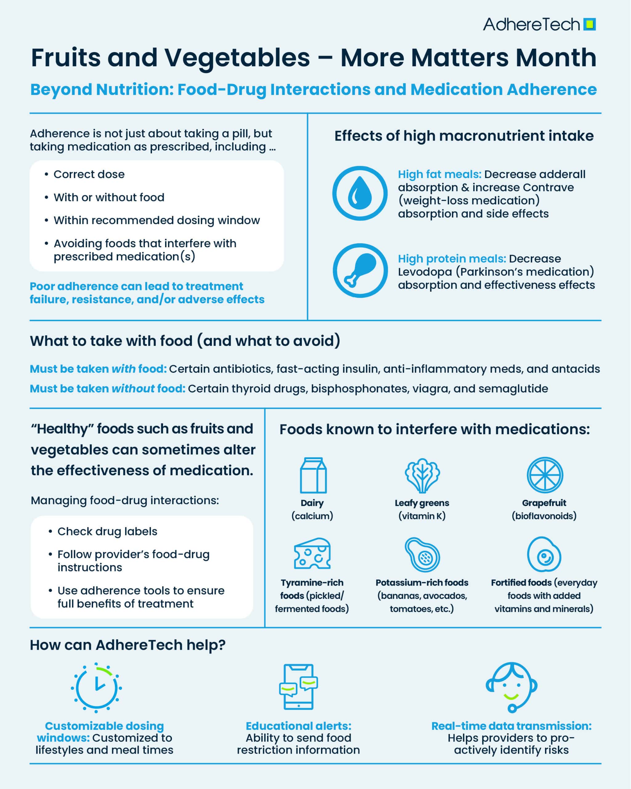 In honor of Fruits and Veggies Matter More Month, we are reminded that healthy eating plays a powerful role in preventing disease and supporting effective treatment. But society’s definition of “healthy” is not always so straightforward — what provides nutritional benefits and protective factors to one individual may interfere with another’s medication. At AdhereTech, we’re committed to empowering patients with the tools and knowledge they need to make safe, informed food choices—so fruits, vegetables, and other nutrient-dense foods can serve their true purpose, helping patients live longer, healthier lives.
