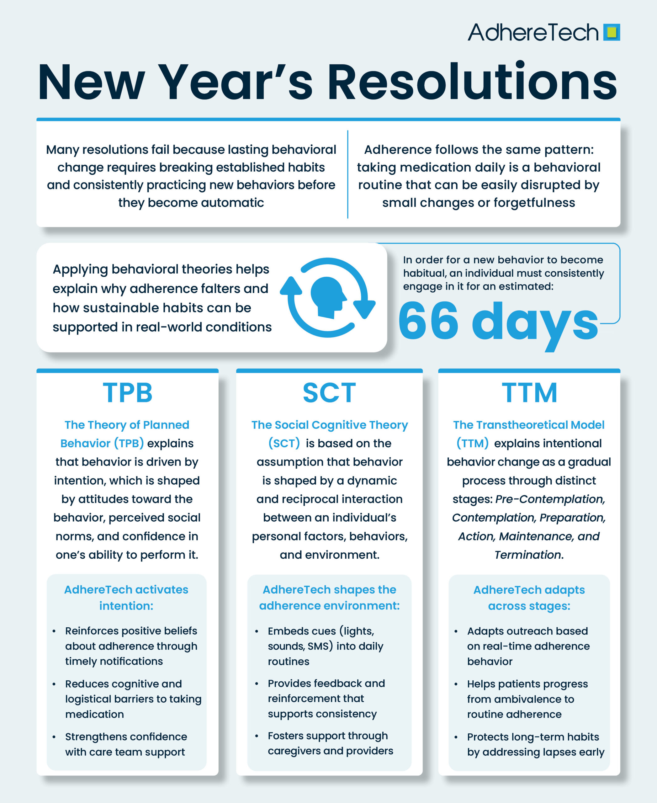 Just as New Year’s resolutions illustrate, knowing what we should do is rarely enough to support long-lasting behavioral change.2, 4 Setting a resolution to exercise or eat healthier demonstrates intention, but sustaining that behavior requires repeated action, environmental support, and reinforcement until it becomes habitual, occurring subconsciously and automatically.1, 2 Medication adherence operates on the same principles: taking medication consistently is a behavior that must be integrated into daily routines, supported by reminders, social encouragement, and systems that minimize barriers.