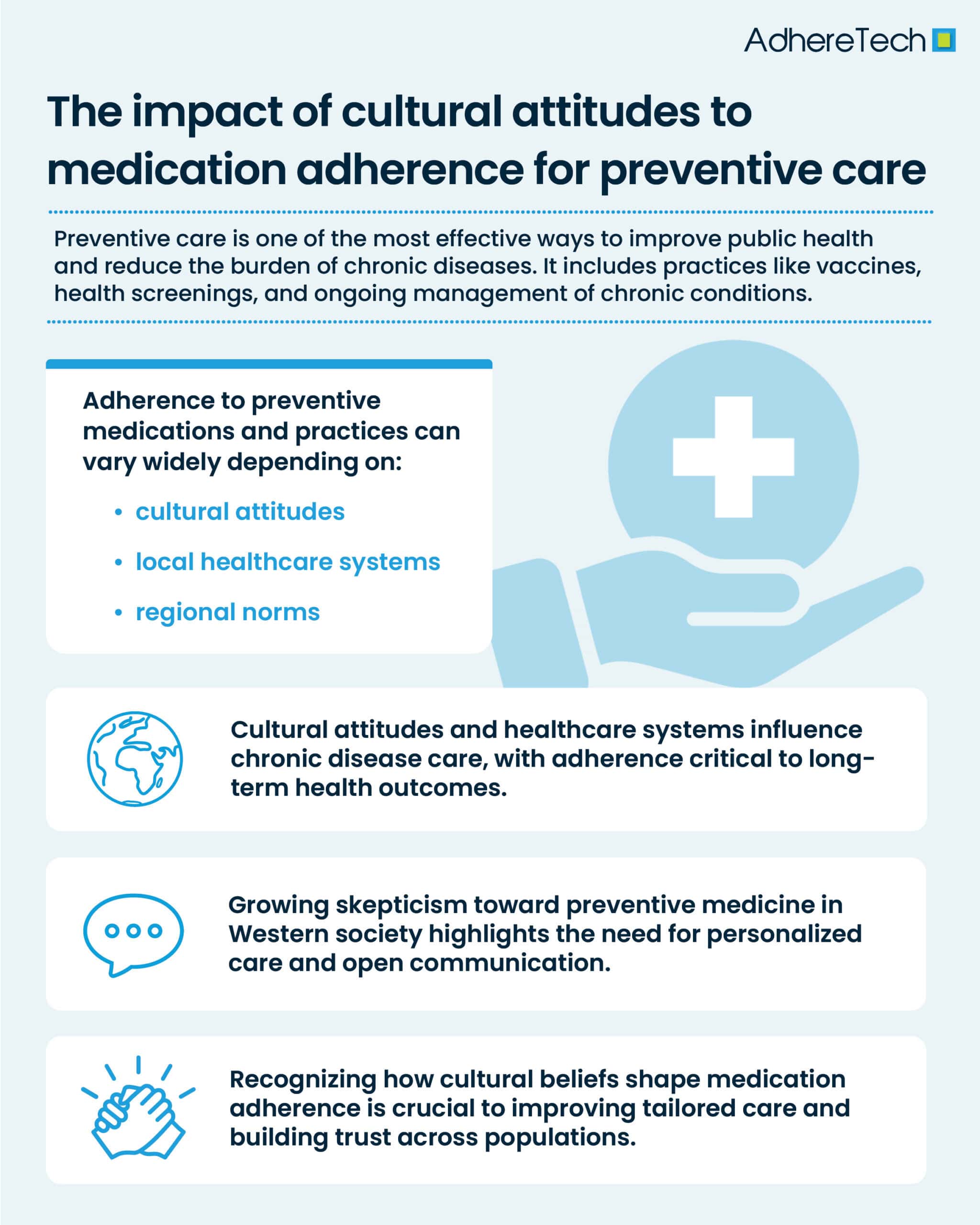 Cultural attitudes toward preventive care, ranging from vaccination to screenings and chronic disease management, can significantly impact how different populations adhere to prescribed medications. These attitudes are shaped by a variety of factors, including historical context, traditional medicine, religion, and socioeconomic status. By recognizing and respecting these cultural differences, healthcare providers can create more effective strategies for promoting preventive care, improving adherence to medications, and ensuring they’re able to deliver the promise of preventative care.